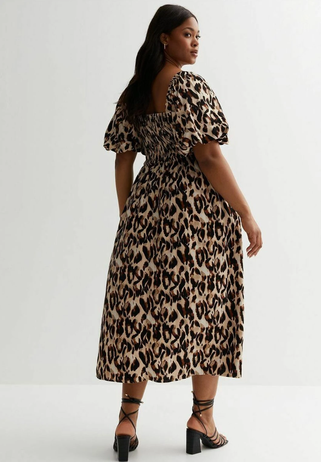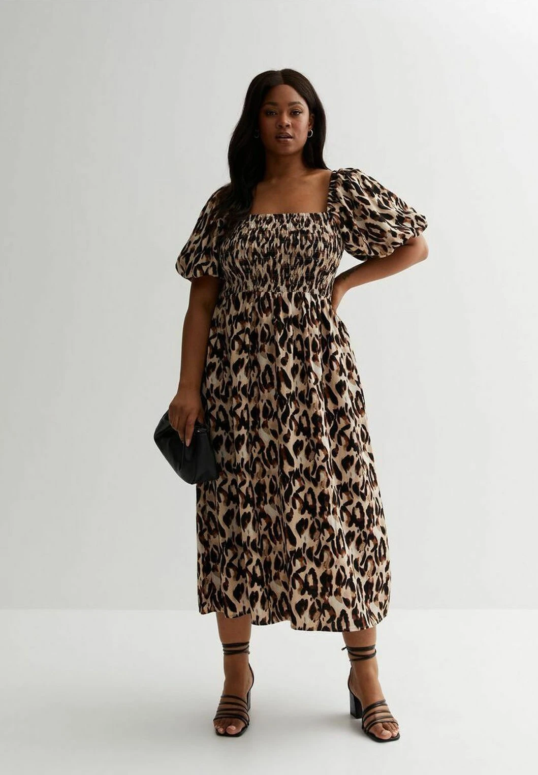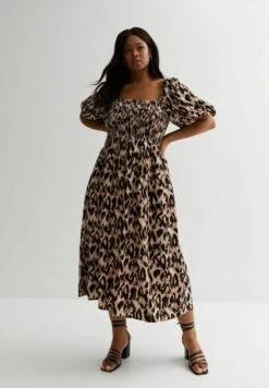 CurvesAnimal Print Shirred Puff Sleeve- Jurk – Black Pattern