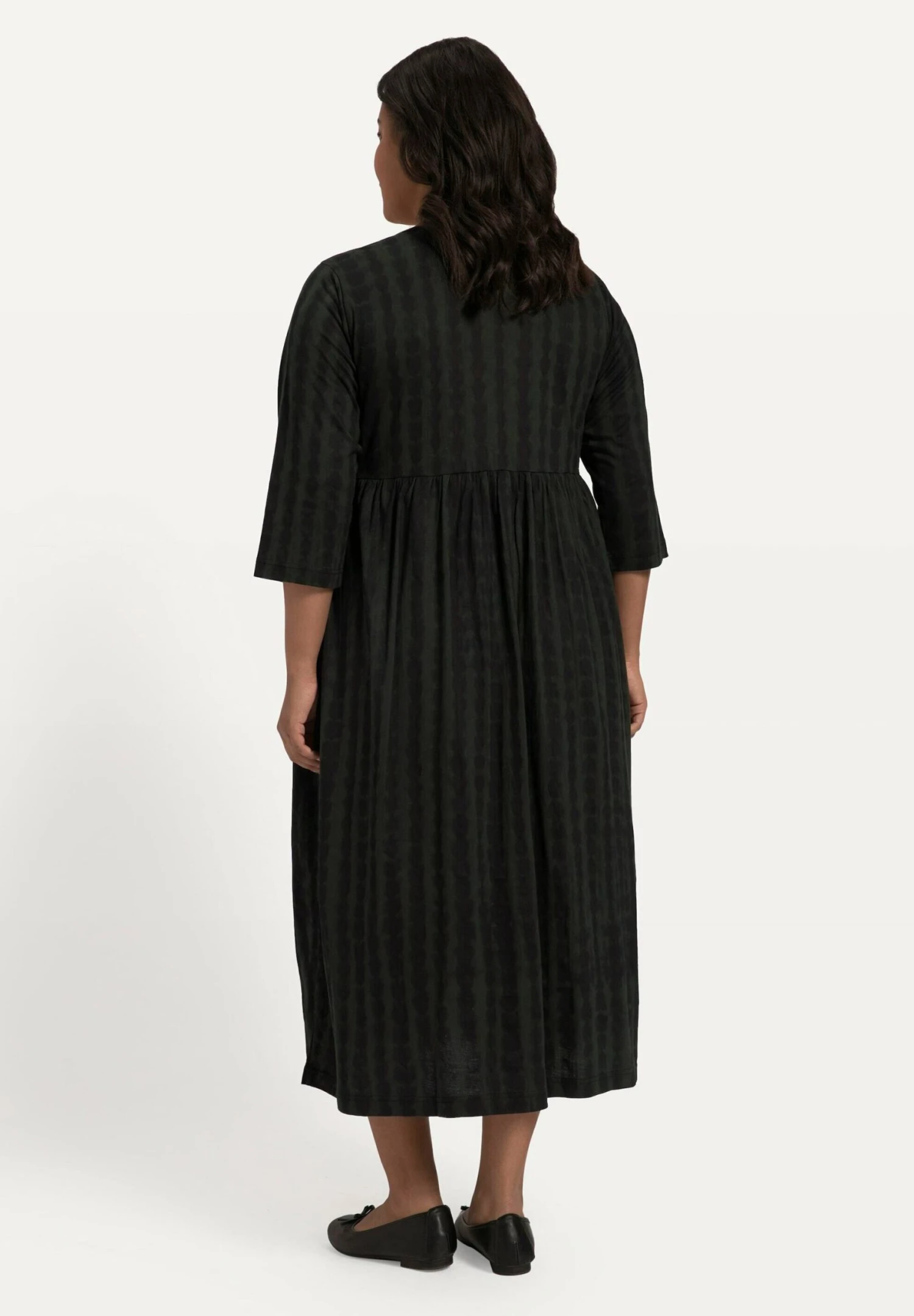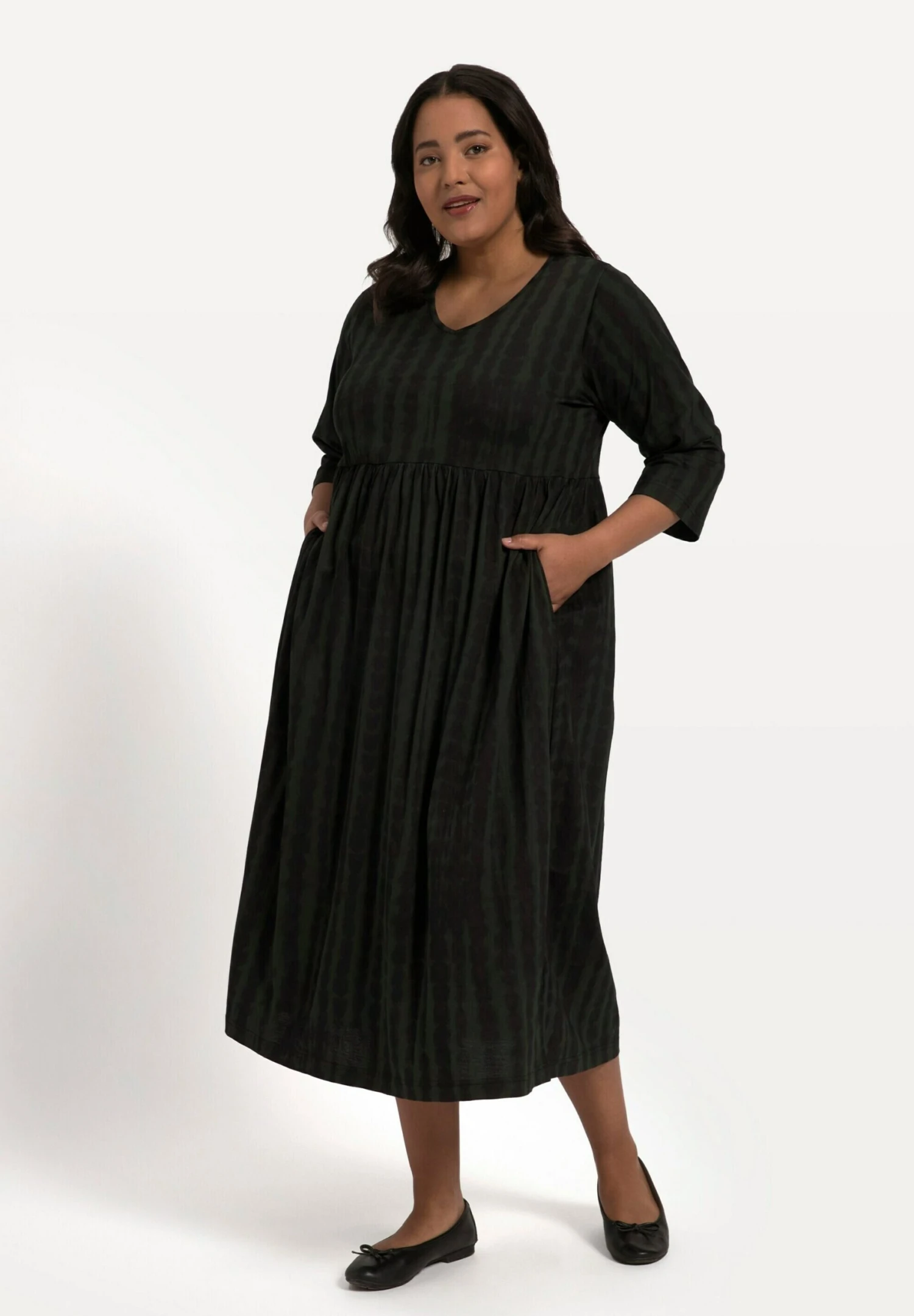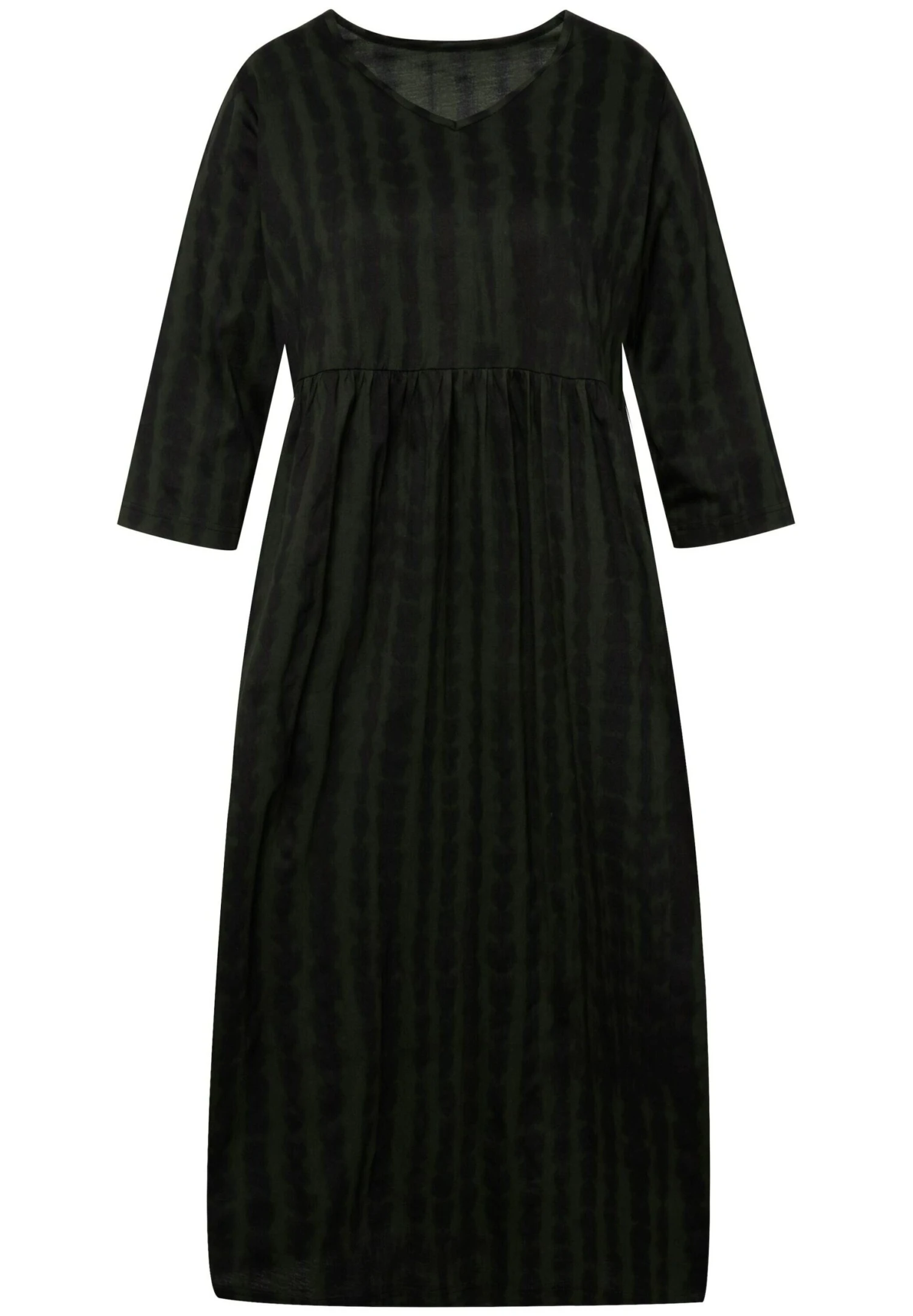 Ulla Popken A-Line BatikdruckEmpirenaht, V-Ausschnitt 3/4-Arm – Jerseyjurk – Olive